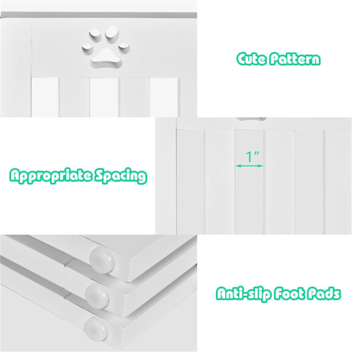 ● Sturdy Structure and Stylish Addition: Made of quality MDF with NC paint, this wooden pet gate is durable for long time use and waterproof for easy maintenance.    And the footpads on the bottom ensure strong stability while protecting your floor from scratches.    Besides, the stylish design can suit any decoration style of your home.