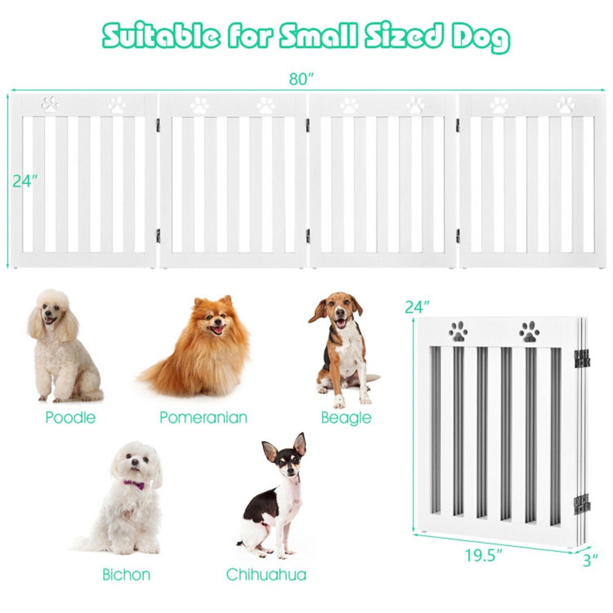 ● Extra Wide and Tall: Dimension of unfolding: 80'' x 36'' x 0.5'' (W x H x D), Dimension of folding: 19.5'' x 36'' x 3'' (W x H x D), Dimension of single panel: 19.5'' x 36'' x 0.5'' (W x H x D), Spacing between slat: 1''.    It is perfect for small-sized dogs and medium-sized dog.