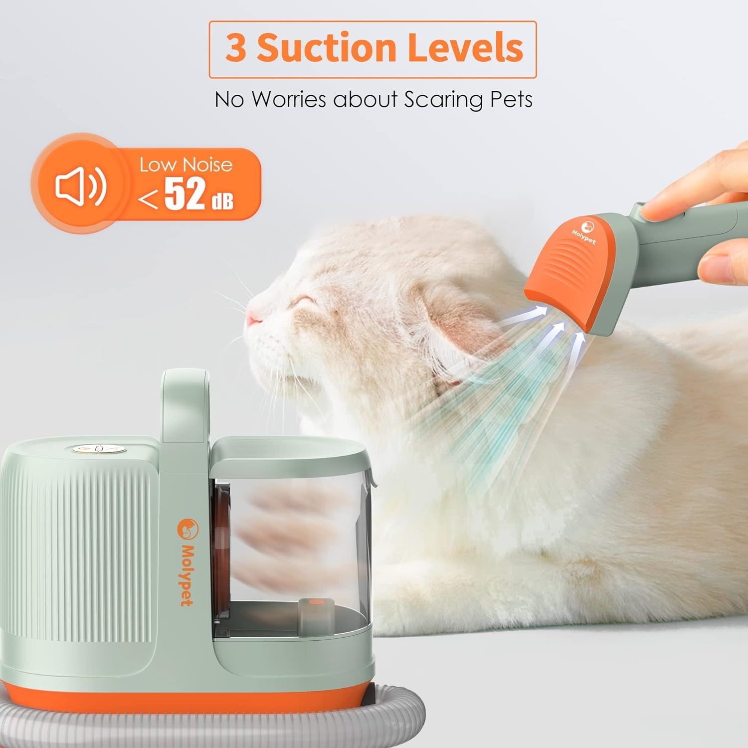 • 【Don't scare your dogs and cats during grooming】 Our pet grooming kit is designed to be low noise and comes with a detachable large dust cup. Our pet grooming hoovers produce less than 52 decibels of noise at first suction levels, and there are 3 adjustable suction levels to choose from. We recommend starting with the first suction level to allow your pet to get used to it